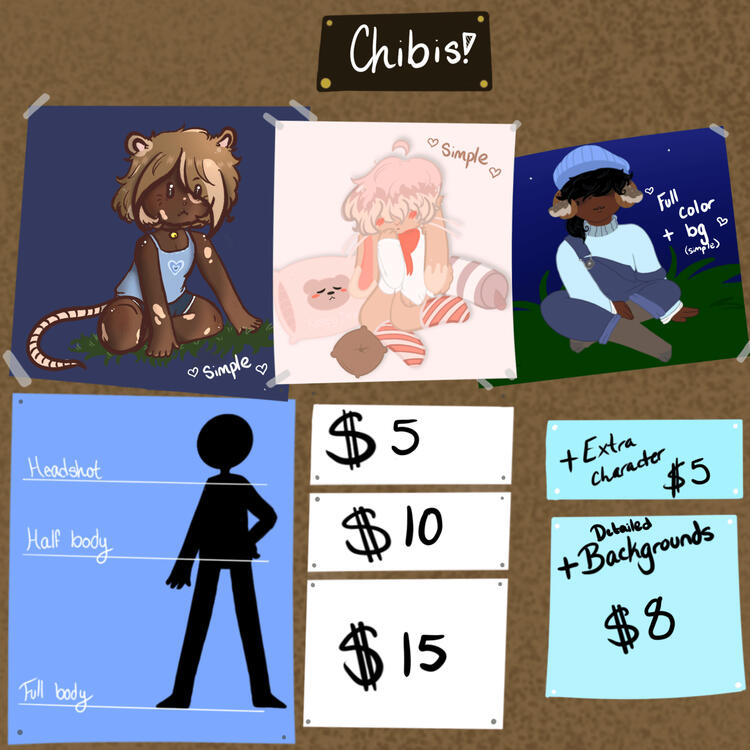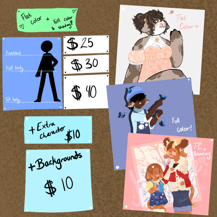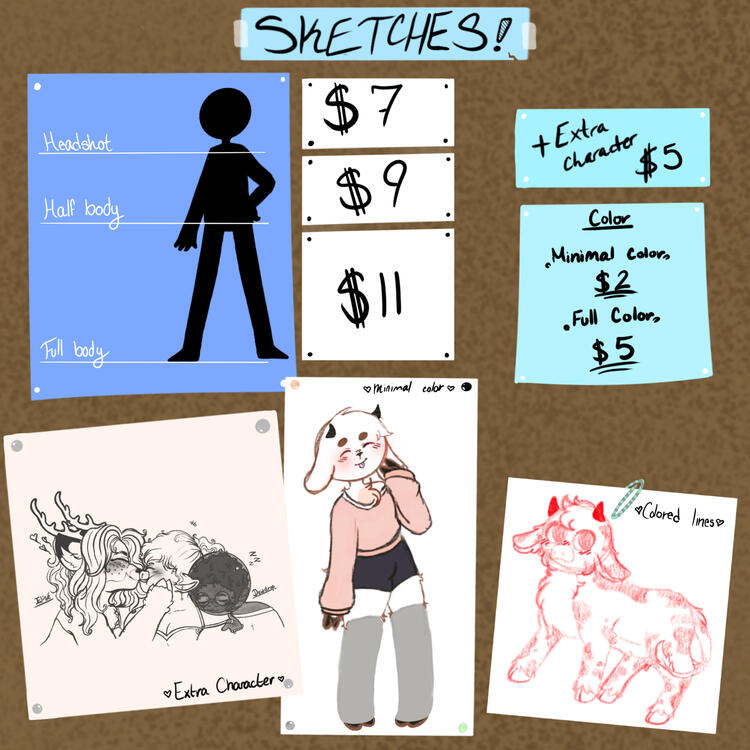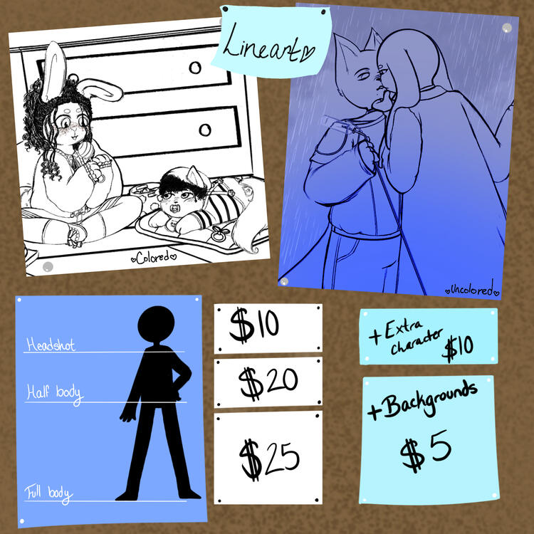 All the types of commissions I do, their prices, and examples to help you out! If you have questions about prices or need some assistance with picking a commission, you can contact me through my email at the home page!!! Please read TOS in the top menu before commissioning me, as it has important information about pricing, what I'm willing to draw, and how you are allowed to share my pieces. !!